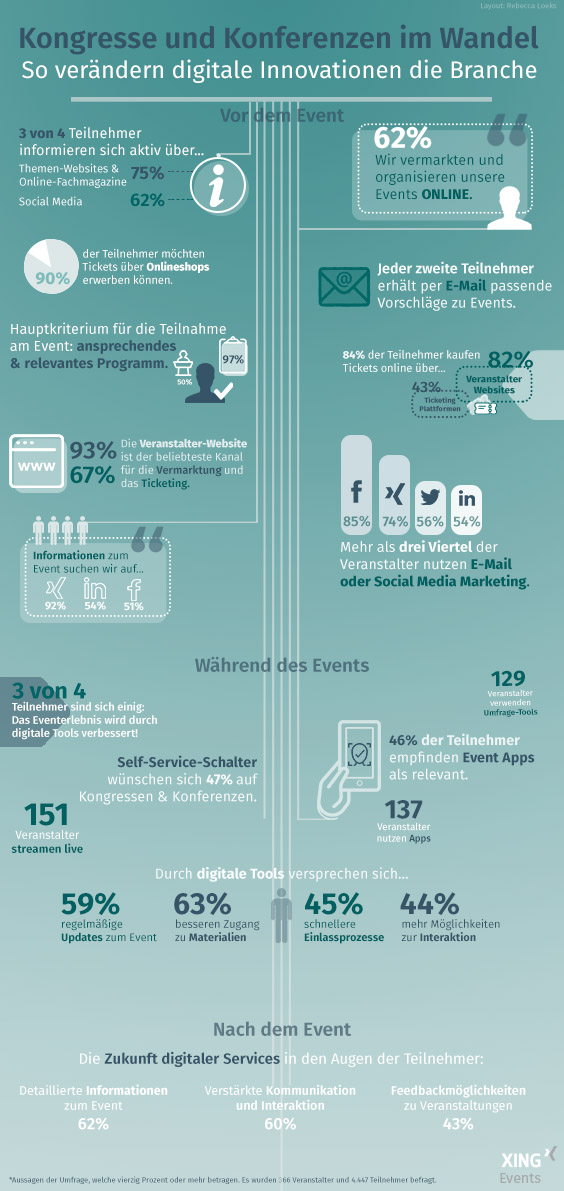XING Events hat die Studie „Konferenzen im Wandel – Wie digitale Innovationen die Branche verändern“ veröffentlicht. Die Studie verschafft Klarheit darüber, inwiefern digitale Innovationen schon auf Kongressen und Konferenzen eingesetzt werden und wie diese die Branche verändern. Die Ergebnisse der breitangelegten Umfrage unter Veranstaltern und Teilnehmern von Kongressen und Konferenzen geben relevante Einblicke in den Wandel der Branche und hilfreiche Tipps für die zukünftige Optimierung der Eventvermarktung.
