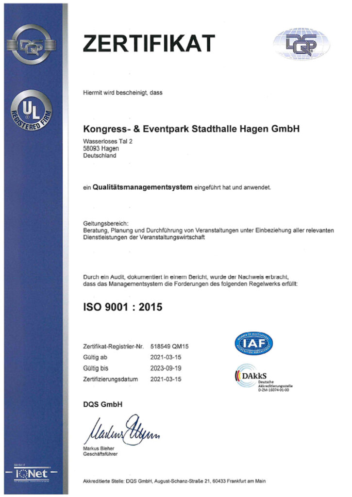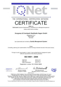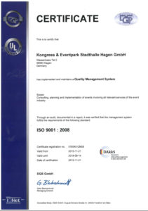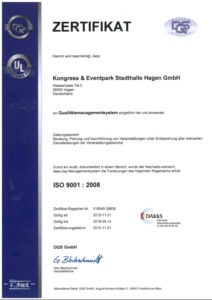 Seit November 2015 ist die Stadthalle nach ISO 9001 zertifiziert und wurde/wird kontinuierlich rezertifiert. Klicken Sie auf die Zertifikatsbilder zum Downloaden der regelmäßigen Zertifikate als PDF.